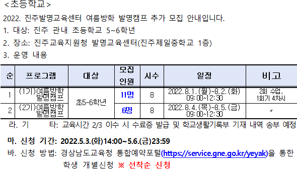추가모집) 2022. 진주발명교육센터 여름방학 발명캠프 추가 모집 안내